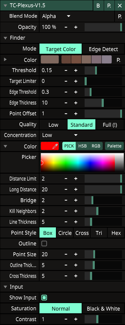 This effect intelligently detects target color or highlights in the camera feed, placing dynamic points wherever light hits strongest. When points move close enough to one another, lines connect automatically, forming an evolving network of geometry and motion.